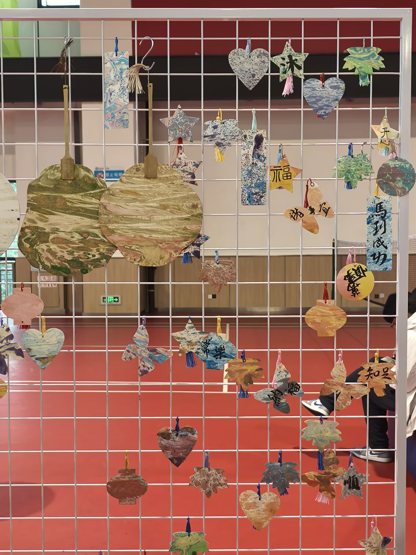 志愿者对漆扇制作流程和方法作了细致讲解,并现场进行制作示范,将多种色彩鲜艳的漆料倒入清水中,轻轻搅动,形成绚丽多彩的“水中画卷”。参与同学们将扇子、书签等放入水中,让漆料逐渐附着在扇面上,待作品水渍渐干,就有书法社的老师和学生帮忙完成漆扇的落字,这样一把完整的漆扇就做好了。