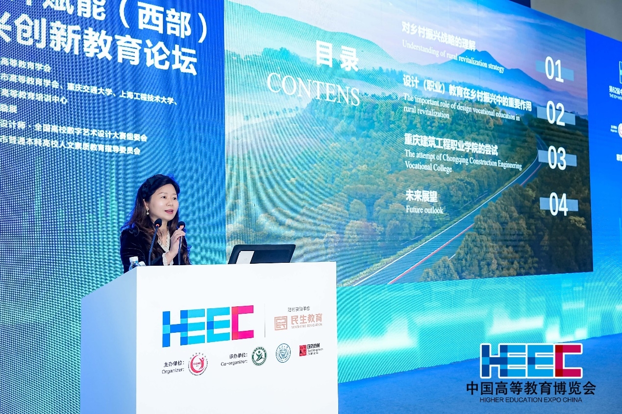 2024年11月15日,第五届设计赋能(西部)乡村振兴创新教育论坛于第62届中国高等教育博览会召开。该论坛由中国高等教育学会指导,重庆市高等教育学会、重庆交通大学、上海工程技术大学、中国高等教育培训中心主办,国药励展承办,未来设计师·全国高校数字艺术设计大赛组委会协办。高露副院长受邀参加该论坛,并作为职业院校代表做主题报告。她以“技能为骨·两翼并重——设计(职业)教育赋能西部乡村振兴的创新路径探索”的主题,介绍了智慧城市设计学院在人才培养模式、“校企政”融合模式以及思政融入模式三方面所展开的创新探索以及取得的阶段性成果,精准赋能西部乡村振兴的技能人才供给、乡村产业振兴与乡土文化复兴,展现了智慧城市设计学院教育优势与特色,彰显了智慧城市设计学院教育风采。