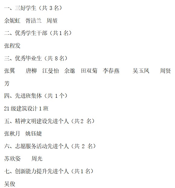 经学生申请,我院部评审已评出2024届市级先进。现将名单予以公示,公示时间为2024年3月15日至2024年3月18日。如有异议,请以书面形式于2024年3月18日10前提交到邮箱404779062@qq.com或者到院部办公室2-323找钟老师。