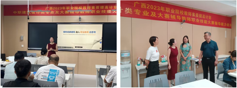 我院教师高玉环应邀在广西建设职业技术学院承办的“三教”改革研修项目中做主题分享,分享主题为“绿色低碳建筑融入职业教育的思考”,向各职业院校专业带头人展示了智慧城市设计学院取得的办学成果,重点围绕建筑设计专业融入绿色低碳建筑教学的培养方案框架设计、课程建设与绿色建筑技能竞赛进行经验分享。