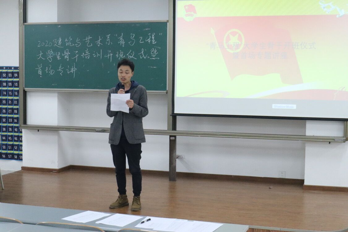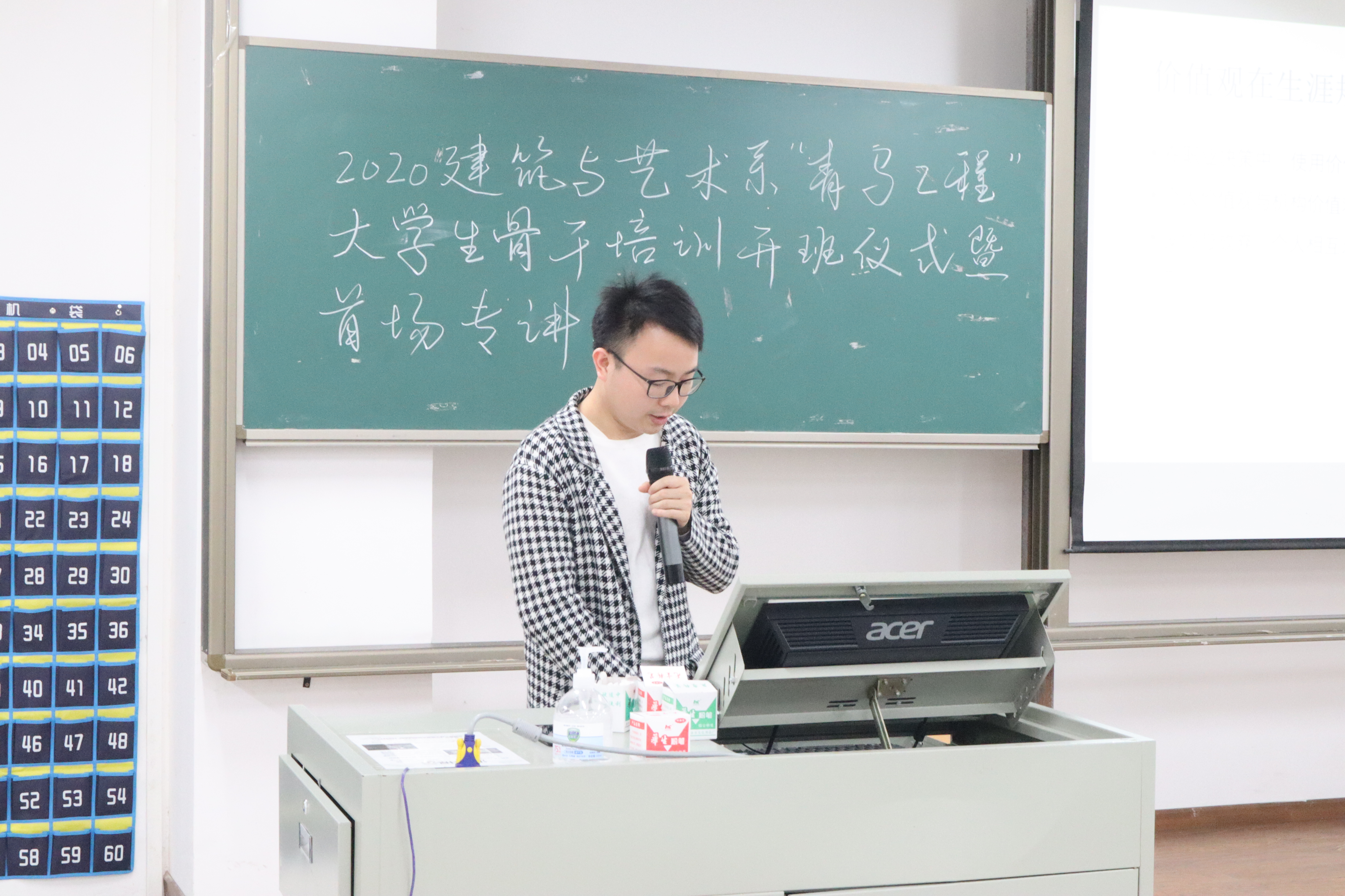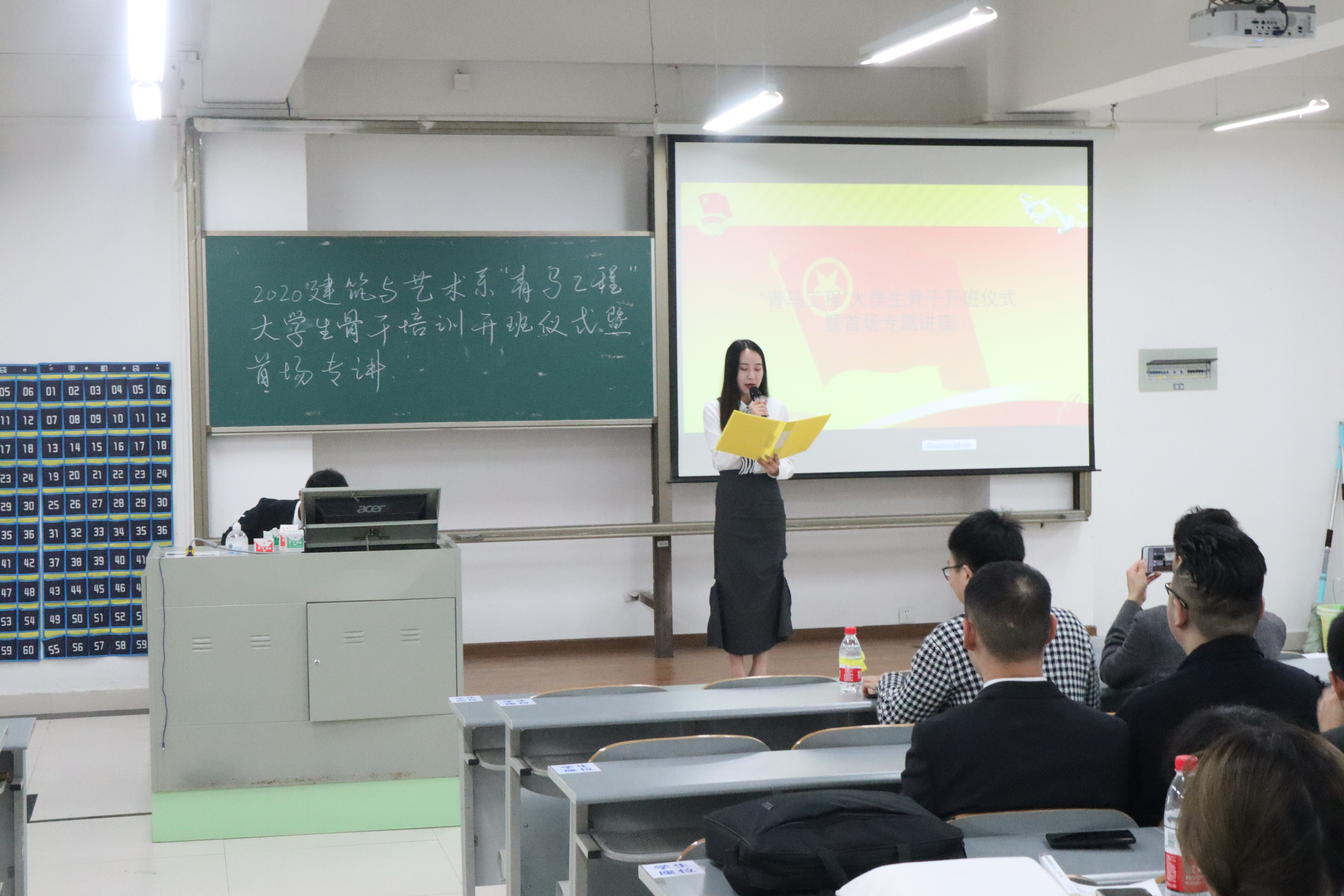 为培养大学生奉献精神,发挥大学生骨干作用,11月19日中午12:10,我院建筑与艺术系“青马工程”大学生骨干培训开班仪式暨专题讲座于求实楼309教室举行。建筑与艺术系团总支副书记王川东、辅导员张樱稆老师,系学生会代表及青马工程全体学员参加仪式。