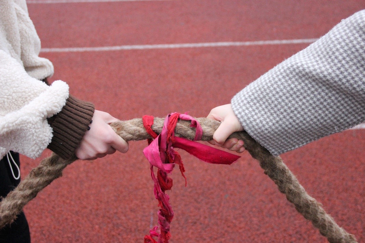 当比赛的哨声一响起,队员们使出浑身力气把绳子向后拉,绳子中间的红线左右摇摆。只听见场上所有人竭力地大喊,“加油!加油!”号子声、呐喊声、此起彼伏,飘荡在整个操场上。比赛中,同学们始终秉承着友谊第一,比赛第二的理念。有一鼓作气直捣黄龙的豪迈,也有相互鼓励越战越强的信心,更有虽为对手却惺惺相惜的情谊。