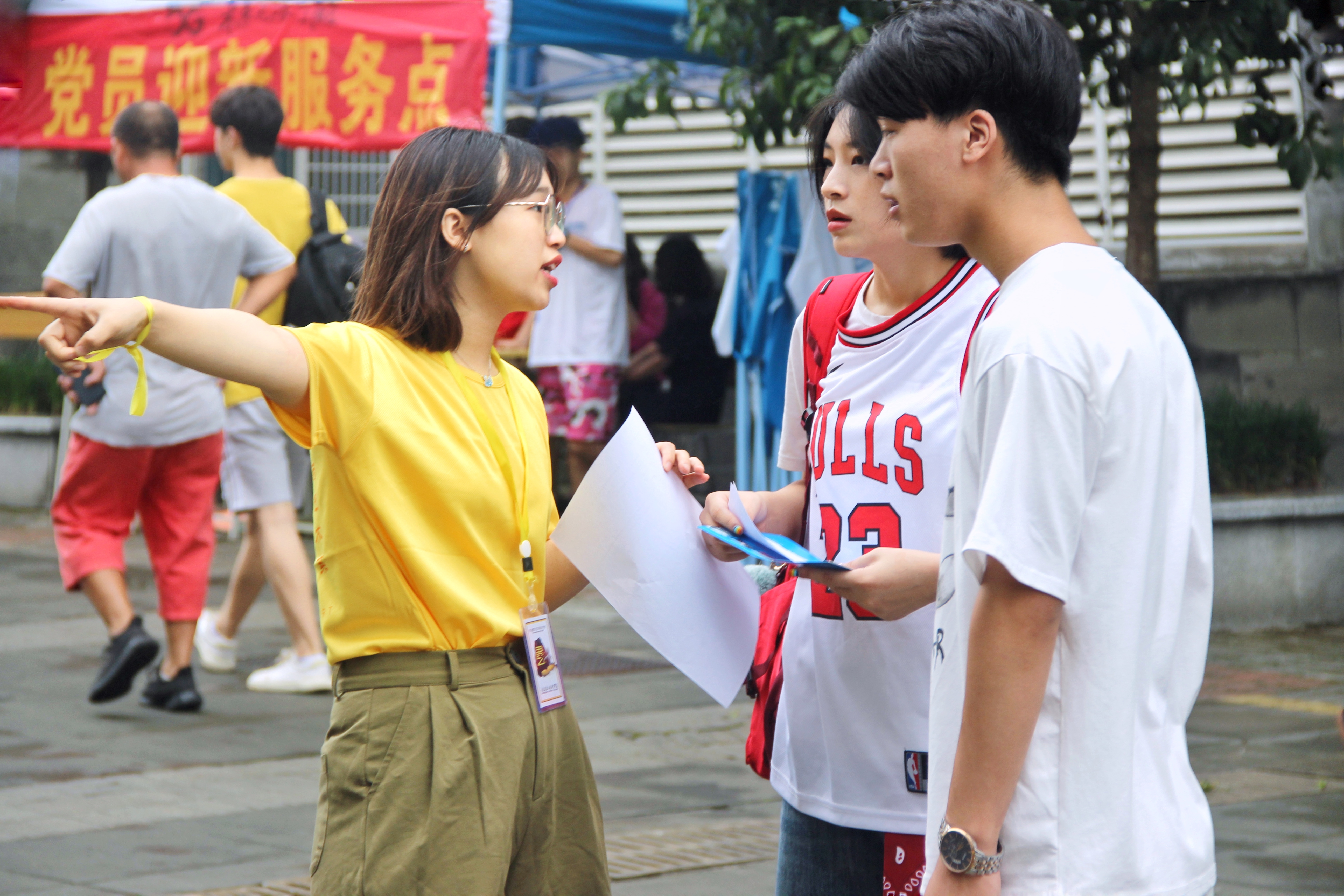 校园里每个角落都能见到身着黄色系服,系着象征建艺系的黄色丝带的建艺志愿者们,他们分别坚守在交通枢纽,陪同新生来校;奔波于校门口和各个报到点,将新生们准确引导至报到地点;有的引导有需求的新生及家长前往绿色通道处办理相关事宜;更多的志愿者带领已完成报到手续的新生前往新宿舍。他们无微不至,及时为新生和家长提供温馨周到的服务。一张张热情的笑脸,一句句亲切的问候,一项项贴心的服务,欢迎远方而来的家人。