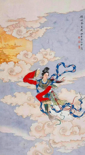 一天,后羿到昆仑山访友求道,向王母求得一包不死药。据说,服下此药,能即刻升天成仙。然而,后羿舍不得撇下妻子,暂时把不死药交给嫦娥珍藏。嫦娥将药藏进梳妆台的百宝匣。三天后,后羿率众徒外出狩猎,心怀鬼胎的蓬蒙假装生病,没有外出。待后羿率众人走后不久,蓬蒙持剑闯入内宅后院,威逼嫦娥交出不死药。嫦娥知道自己不是蓬蒙的对手,危急之时她转身打开百宝匣,拿出不死药一口吞了下去。嫦娥吞下药,身子立时飘离地面、冲出窗口,向天上飞去。由于嫦娥牵挂着丈夫,便飞落到离人间最近的月亮上成了仙。