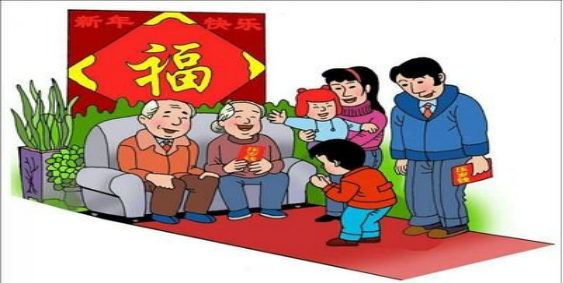 春节拜年时,晚辈要先给长辈拜年,祝长辈长寿安康,长辈可将事先准备好的压岁钱分给晚辈,据说压岁钱可以压住邪祟,因为“岁”与“祟”谐音,晚辈得到压岁钱就可以平平安安度过一岁。压岁钱有两种,一种是以彩绳穿线编作龙形,置于床脚,此记载见于《燕京岁时记》;另一种是最常见的,即由家长用红纸包裹分给孩子的钱。压岁钱可在晚辈拜年后当众赏给,亦可在除夕夜孩子睡着时,由家长偷偷地放在孩子的枕头底下。现在长辈为晚辈分送压岁钱的习俗仍然盛行。