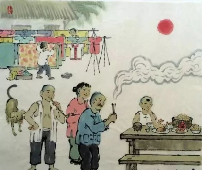 食新:将新打的米、麦等磨成粉,制成各种面饼、面条,邻居乡亲分享来吃,表达对丰收的祈愿。同时,这些新货也要准备一份祭祀祖先,恳请保佑风调雨顺。