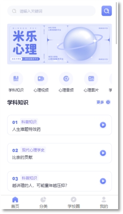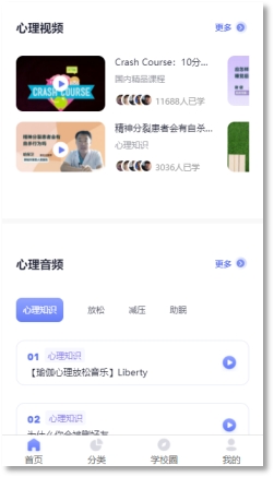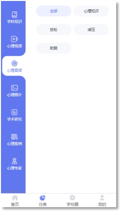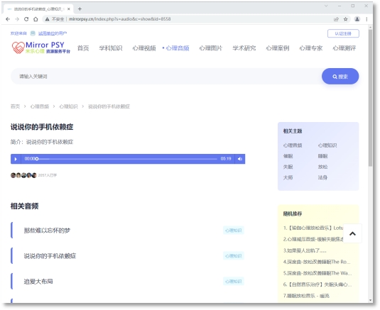 1.音频浏览:通过首页顶部的菜单进入心理音频模块,鼠标上下滚动快速浏览心理音频,点击类型可以快速切换音频类型。