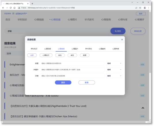 3.音频检索,在页面上部搜索框中输入您感兴趣的内容,点击搜索按钮即可进入搜索页面,支持关键词快速搜索,支持标题、关键词、类型和详情等高级搜索。