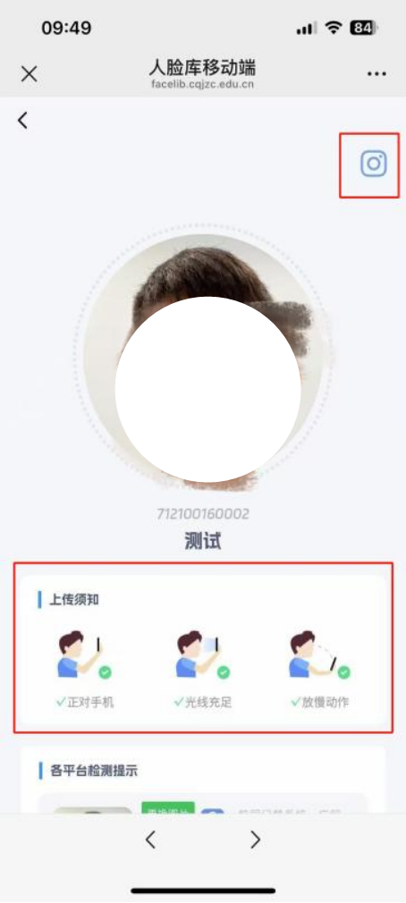 2.阅读拍照提示(正对镜头、露出五官等)→ 点击顶部【相机图标】如下图: