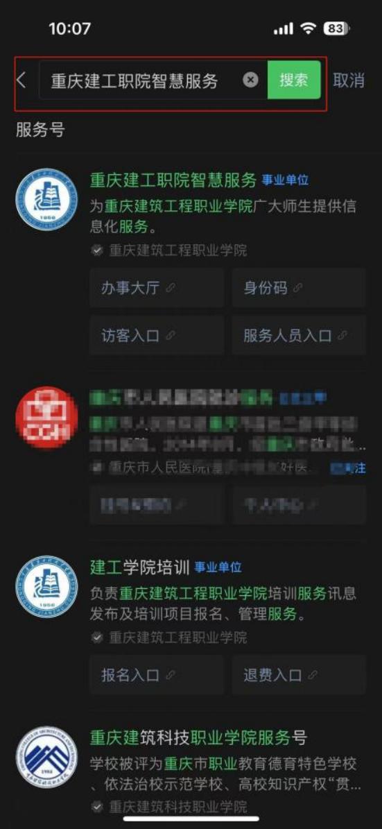 3.在搜索框输入【重庆建工职院智慧服务】→ 点击搜索结果中的官方服务号如下图: