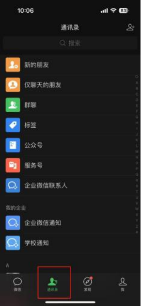 1.打开微信→ 点击底部导航栏【通讯录】如下图: