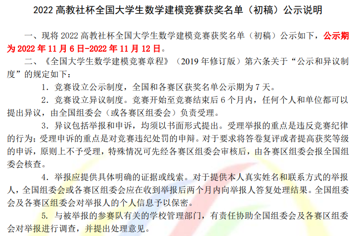 2022年11月6日,全国大学生数模官网对2022高教社杯全国大学生数学建模竞赛获奖名单(初稿)进行了公示,koko体育基础教学部数学教研室蒋燕和李倩老两位老师分别指导的两个竞赛队进入专科组全国二等奖公示名单(http://www.mcm.edu.cn/html_cn/node/e6db70b8d7a12ae11904ae9335053590.html),公示期为2022年11月6日一11月12日。