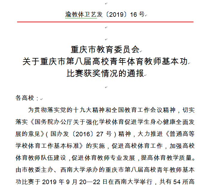 2019年9月20日-22日,由重庆市教委主办的两年一度的“重庆市第八届高校青年体育教师基本功大赛”在西南大学举办,全市54所高校代表队的教师参加了比赛。大赛设置有理论考试、立定三级跳远、实心球、半场往返运球投篮、50米自由泳,以及男子1000米、女子800米六个体能、竞技项目。