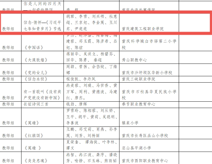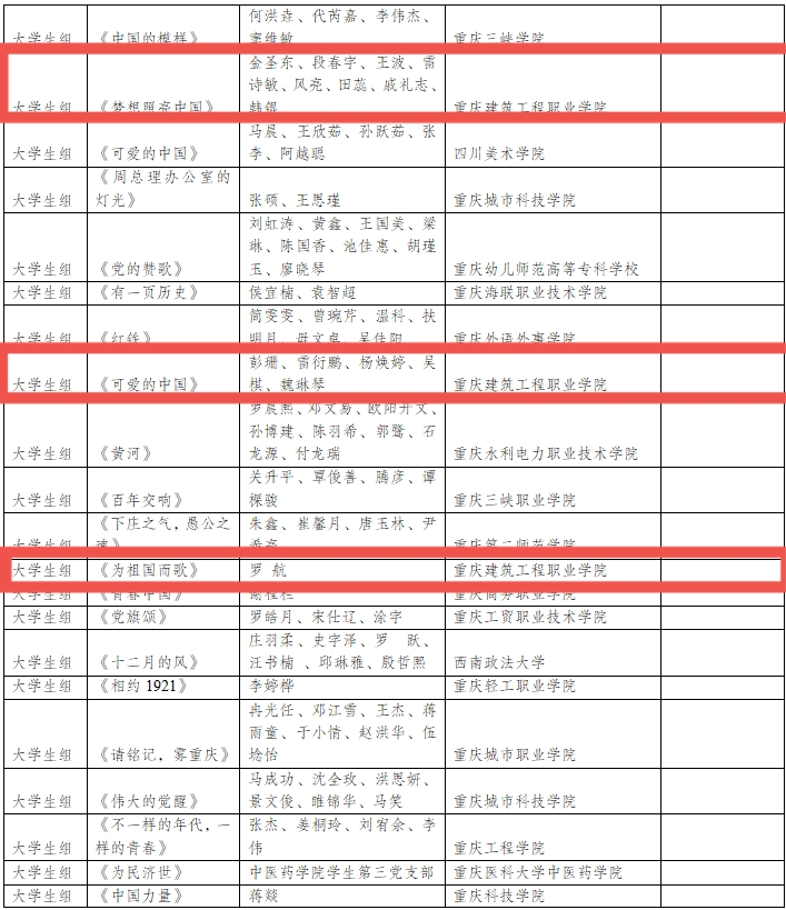 据悉,koko体育高度重视本次大赛,在校内广泛宣传动员,发动院系师生积极参赛。最终《梦想照亮中国》《可爱的中国》《为祖国而歌》荣获大学生组三等奖;《信念·情怀》荣获教师组三等奖。