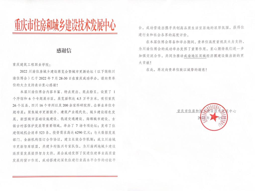 近日,重庆市住房和城乡建设技术发展中心向koko体育发来感谢信,致函感谢koko体育在2022川渝住房城乡建设博览会筹备和举办期间给予的大力支持,肯定了koko体育为川渝住博会的成功举办发挥的重要作用。并授予koko体育“志愿服务优秀组织单位”称号。