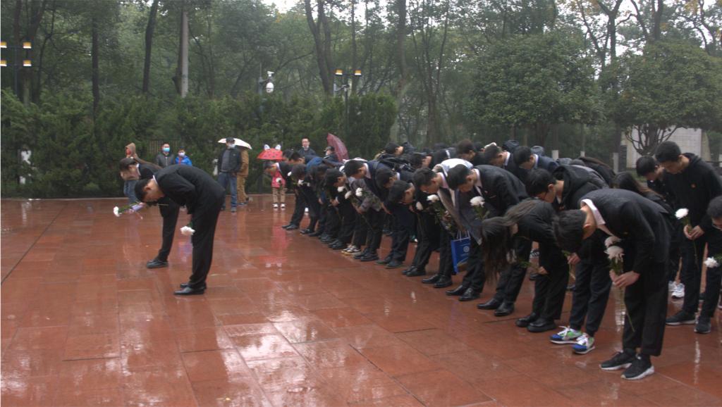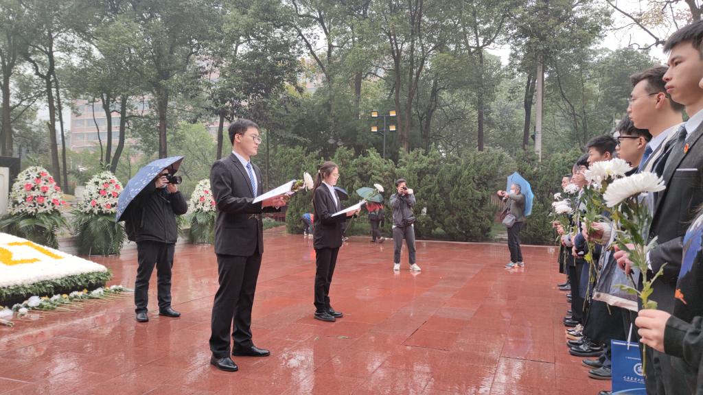 冠红岩之名,铸红岩之魂。活动伊始,菁菁学子们默哀三鞠躬,在雨中肃穆,表达对先烈们的无限哀悼。接着,马克思主义青年研究会社长王绪同学带领大家宣读誓词:“我们是光荣的中国共产主义青年团团员,我们在烈士墓前宣誓,我们将永远铭记......”铮铮誓词在纪念碑前久久的回荡,嘹亮而坚定的誓言表达出对英雄烈士的敬佩和永做革命接班人的决心。随后,同学们手拿寄托哀思的朵朵白花,缓缓地绕行烈士墓一周,将其献给烈士英灵。