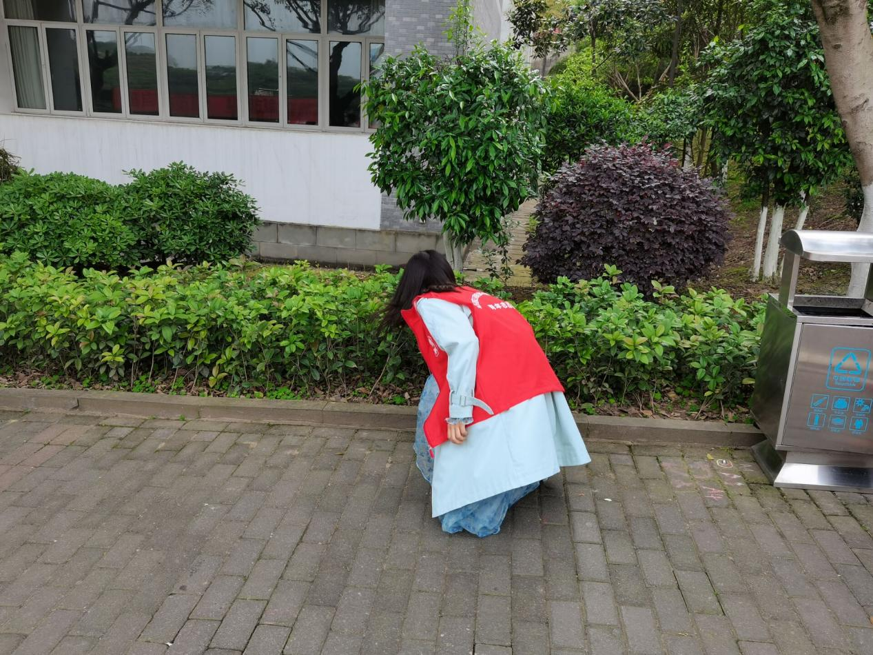 活动开始前,由活动负责人将志愿者们分成几个小组,并划分了各小组负责区域。活动正式开始后,大家便各自认真投入到其中。活动现场,志愿者们身着红马甲,忙碌的身影在操场上、教学楼周边等处穿梭不停,“一踩一折一放”,志愿者们认真细致、不怕脏不怕累,将捡拾起的垃圾分类装进了提前准备的垃圾袋里,待活动结束后统一投放至各类垃圾桶中。