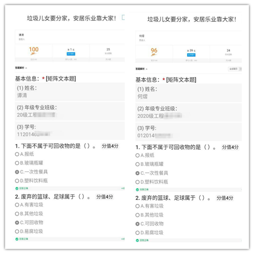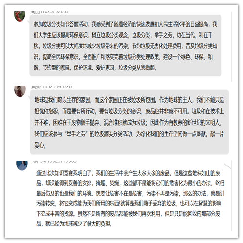 本次答题活动主要围绕可回收垃圾、厨余垃圾、有害垃圾、其他垃圾相关知识进行开展,深层次提高大学生对各类垃圾投放情况的了解,让大学生进一步了解垃圾的种类。本次答题活动采用线上答题的方式开展,新颖、实用性强,实现了多地点、同时间、全覆盖、高参与的垃圾分类知识普及,对进一步促进本系大学生对垃圾分类的掌握程度的提高起到了积极作用。