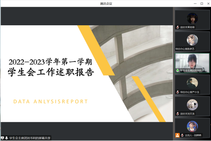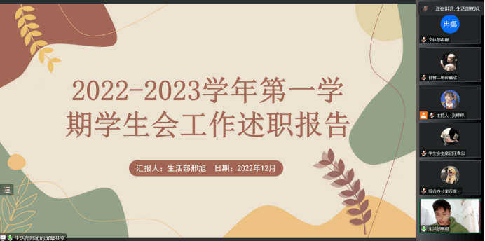 为深化学生会组织改革,落实学生会述职评议制度,促进学生会组织规范化发展,2023年1月4日,koko体育官网建设管理学院学生会2022-2023学年第一学期述职评议大会通过腾讯会议顺利召开。