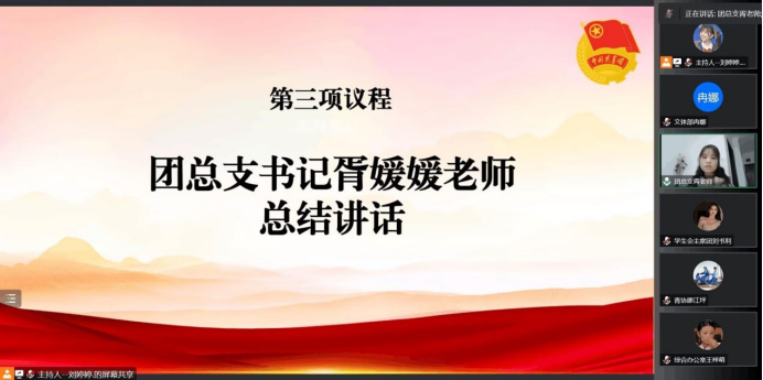 学院团总支书记胥媛媛老师充分肯定了学生会这一学期所取的工作成绩,对学生会本学期的工作与付出表示感谢。她希望各位学生会干部、干事能够明确职能定位,全心全意为同学服务,加强作风建设,坚持从严治会,养成廉洁、自律、守纪的工作作风;加强组织建设,各部门分工协作、齐心协力发挥好学院和同学之间的桥梁纽带作用。同时,胥老师也为同学们送上了新年寄语,祝福同学们学业有成、新年快乐。