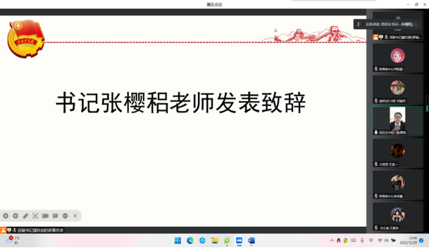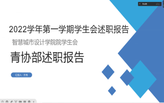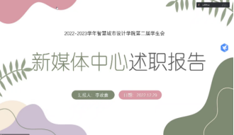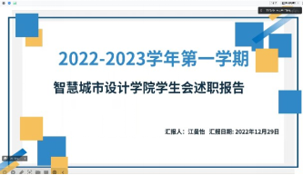 为了更好地推动学生会工作发展,进一步发挥学生骨干的模范带头作用。2022年12月29日,智慧城市设计学院2022-2023学年学生会第一学期工作述职评议大会采用腾讯会议在线上顺利召开。出席本次会议的有设计学院团总支书记张樱稆,以及全体学生会成员。