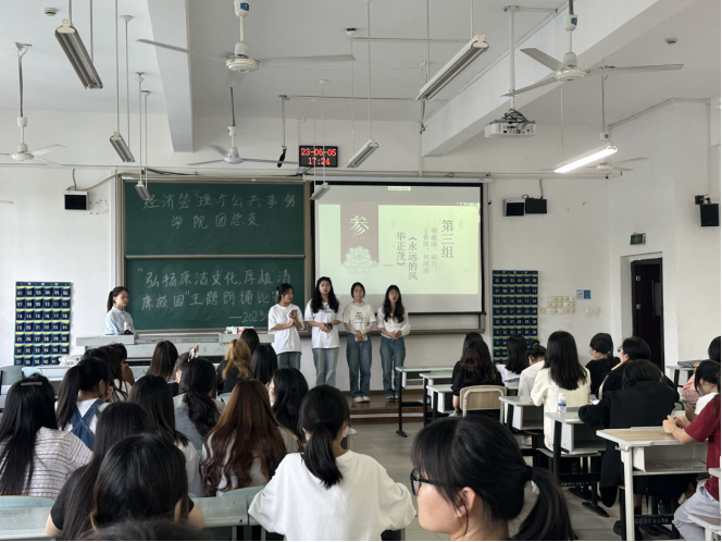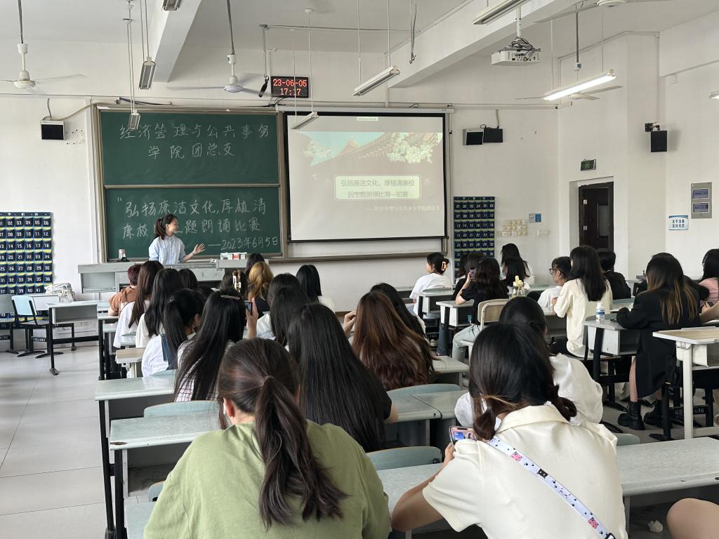 为进一步加强校园廉洁文化建设,营造风清气正的校园育人环境。经济管理与公共事务学院于2023年6月5日在求实楼202室顺利开展了以“弘扬廉洁文化,厚植清廉校园”为主题的朗诵比赛,全体学生会干部、干事及学生代表参加。