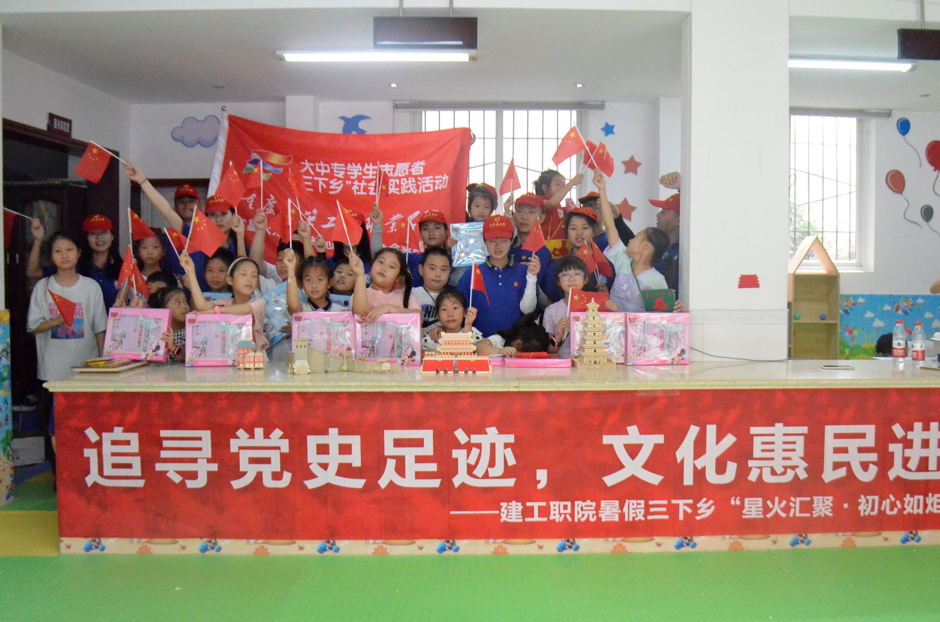 “小朋友,如果不小心溺水了怎么办呢?”“我知道,我知道……”课堂上,团队成员通过ppt动画、真实案例、顺口溜、故事讲解等方式,为小朋友们带来了一场精彩生动的安全知识小课堂,用爱心呵护留守儿童健康快乐成长。随后,团队成员们带着小朋友一起制作红军包、拼搭红色建筑模型、开展课业辅导、诗词朗诵等活动,陪伴孩子们度过了一段快乐的学习之旅,让爱党爱国的种子播撒进了孩子们稚嫩的心灵。