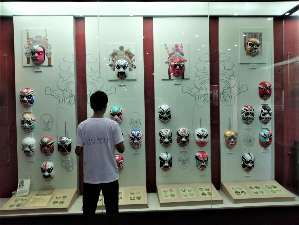 川剧,俗称川戏,是融汇高腔、昆曲、胡琴(即皮黄)、弹戏(即梆子)和四川民间灯戏五种声腔艺术而成的传统剧种。作为中国戏曲宝库一颗璀璨的明珠,2006年经国务院批准列入第一批国家级非物质文化遗产名录。近日,在严格遵守疫情防控要求的前提下,实践团成员来到重庆市川剧院进行参观调研,探秘川剧的魅力。走进川剧院,实践团成员便被威严肃穆且又古色古香的建筑深深震撼。川剧博物馆分为《艺苑奇葩》、《巴蜀沃土》、《川剧英华》、《巴渝风韵》4个展区,有图片500余张,实物近1000件。展厅内金碧辉煌的明清古戏台为异地复建的文物,所有部件均为原件,戏台上的木雕被重新描上了金漆,金光闪烁。此外,红色忠肝义胆的关羽、黑色铁面无私的包公、白色阴险狡诈的曹操等各色人物在脸谱墙一一呈现,十分惊艳。