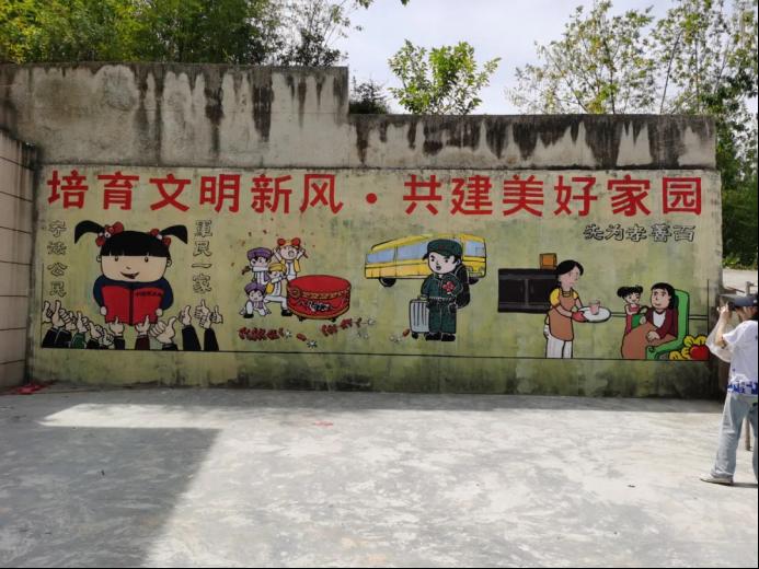 为结合磨子乡当地实际,加强当地农村文化建设,以图文并茂、群众喜闻乐见的方式传播精神文明、丰富文化生活,满足广大群众对文明文化的需要,7月13日-15日,koko体育智慧城市设计学院“筑梦百年,见证发展”社会实践团在忠县磨子乡开展了“培育文明新风,共建美好家园”墙绘绘制活动。