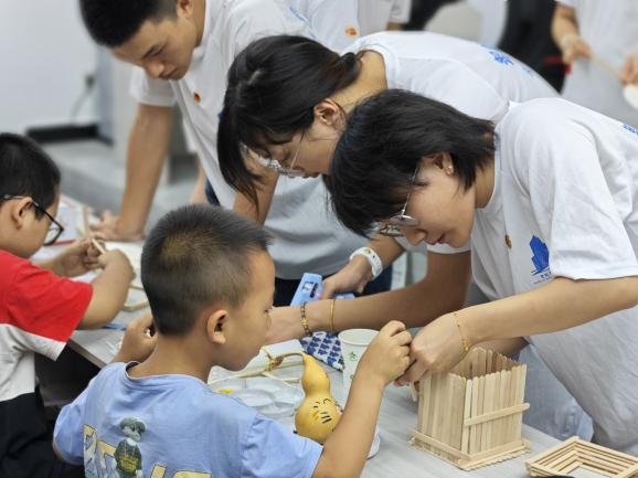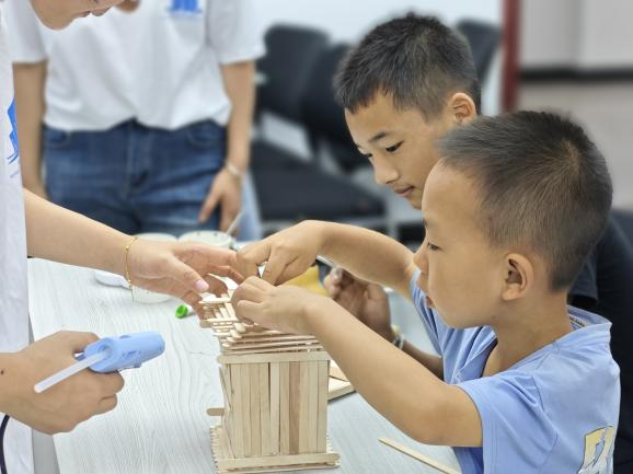 智能建造学院“匠心筑梦 燃梦青春”实践团开展“搭建理想小屋”活动,为孩子们打开工程思维的大门。面对散落的积木零件,志愿者们化身“工程导师”,用“如何让小屋站得更稳”等问题引导思考,示范并鼓励小朋友积极动手实践。孩子们的力学基础认知与空间构造思维在实践中悄然萌芽。当一座座造型各异的“理想小屋”矗立桌上时,孩子们欢呼雀跃,眼中闪烁着创造的星火。