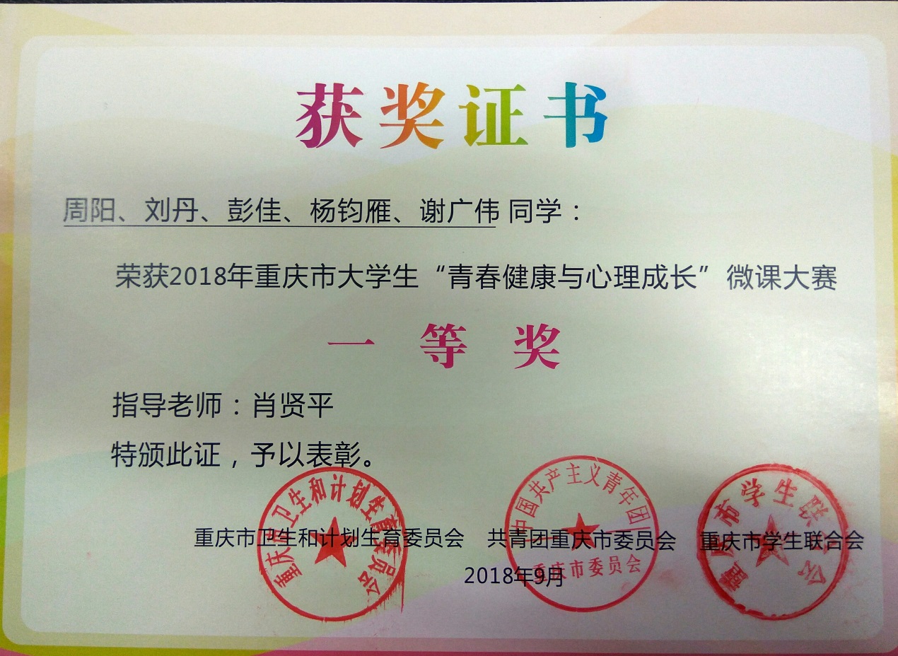 10月31日,重庆市第九届大学生心理成长论坛微课大赛总结颁奖会在重庆交通大学举行,大赛由重庆市卫生和计划生育委员会、共青团重庆市委员会、重庆市学生联合会主办。