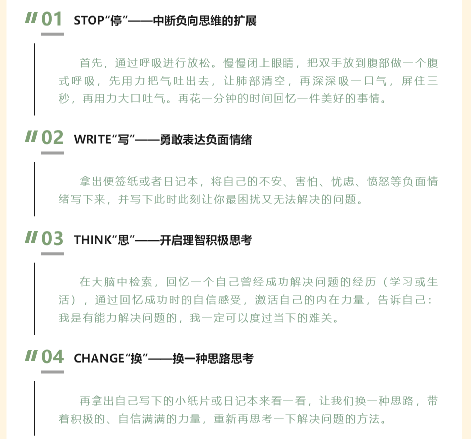 从舒适安逸的居家生活,到阔别已久的校园环境,同学们的生理和心理都会对这样的转变产生警觉,也难免会出现诸如焦虑、紧张、烦躁等负性情绪,我们可以用“SWTC”法来调节情绪,做好返校的心理准备。