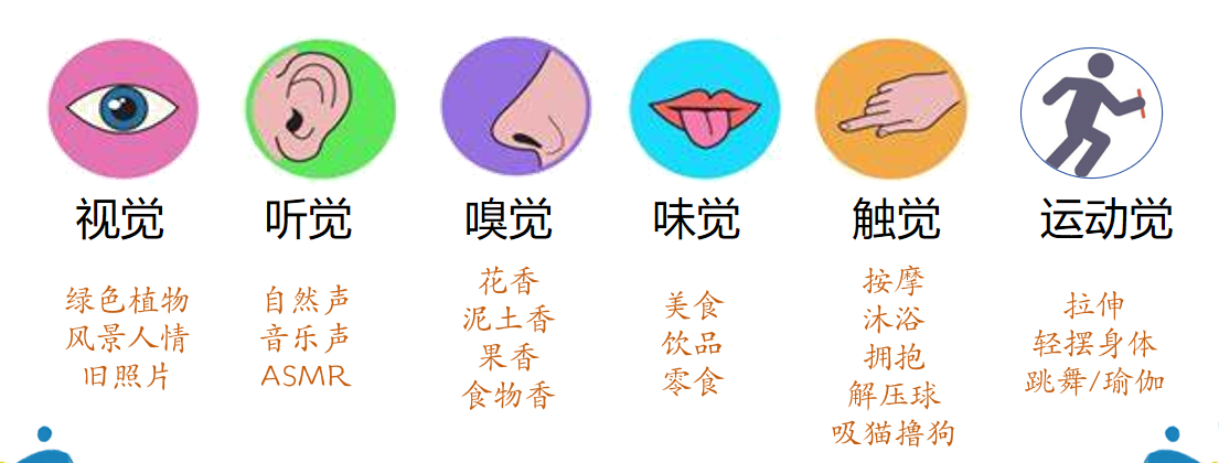 相信身体和心理的能量,学会自我安抚,主动地从视觉、听觉、嗅觉、味觉、触觉和运动觉给自己正性刺激,为自己的身心开辟一方宁静天地。