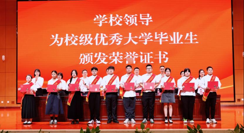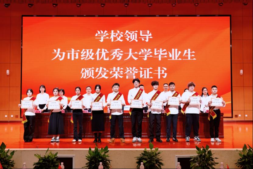 雄壮的国歌声响彻多功能厅,全体师生齐声高唱,毕业典礼正式拉开序幕。学校纪委书记赵国宣读市级优秀大学毕业生名单、校级优秀大学毕业生名单,与会领导为获奖学生颁奖,为校友联络员颁发荣誉证书和聘书。
