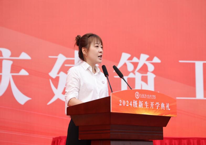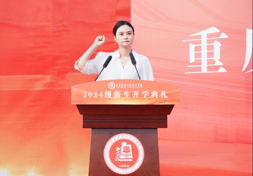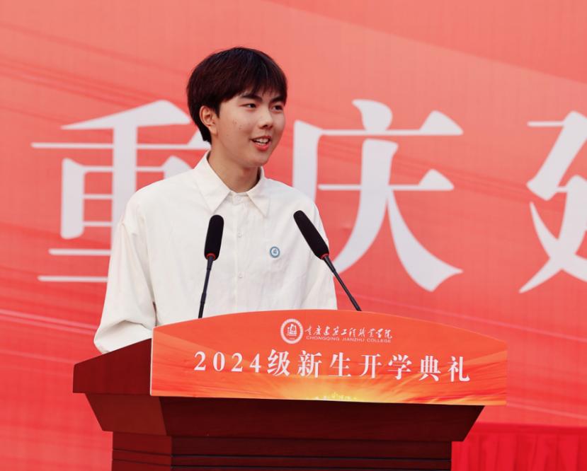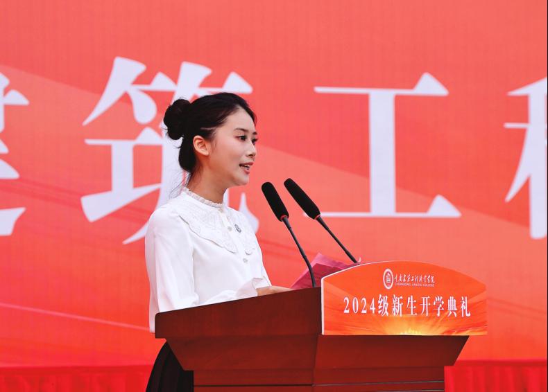智慧城市设计学院2024级蒋佳言代表新生发言,她表示希望大家同她一起,在大学的旅途中刚毅勇敢,向优秀学习、与强者比拼,在理论与实践的碰撞中浇灌理想的花朵,结出丰硕的果实。