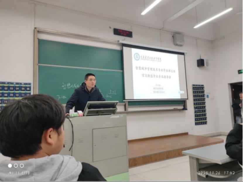 为深化教育教学改革,推动专业建设与学风建设深度融合,城市治理学院在原有“一班一学业班主任”制度基础上,以智慧城市管理技术专业为试点,积极探索实施“学业班主任轮值会议制度”,以创新机制促进专业信息共享,助力智慧城市管理技术新专业高质量发展。在学院党政领导班子部署与推动下,智慧城市管理教研室制定了详细的学业班主任轮值安排计划,并于11月26日晚上成功召开了首次学业班主任轮值会议。会议由院长工作助理、智慧城市管理技术专业带头人王玉合博士主持,辅导员姜丽华及2025级智慧城市管理技术专业全体同学共同参加,围绕专业前景、学什么、如何学、未来发展等学生关注的热点议题展开师生间、班级间的讨论与信息交流。