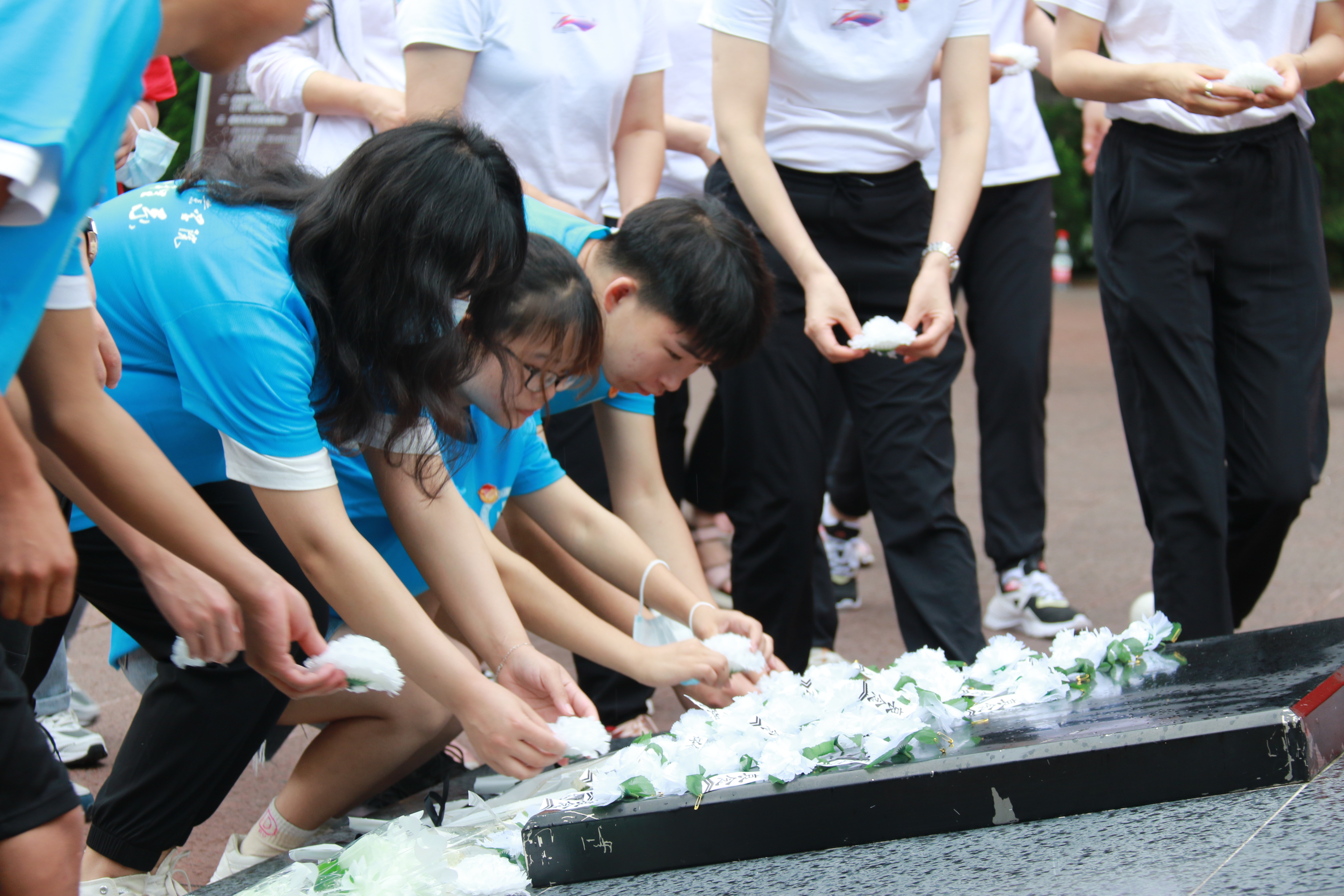 14时许,红岩魂广场夏雨纷纷,全体师生表情肃穆,聆听着带队老师讲解红岩烈士们可歌可泣的英雄事迹,冒着小雨向烈士敬献白花,以表达对先烈们为新中国解放做出伟大贡献的无限哀思。