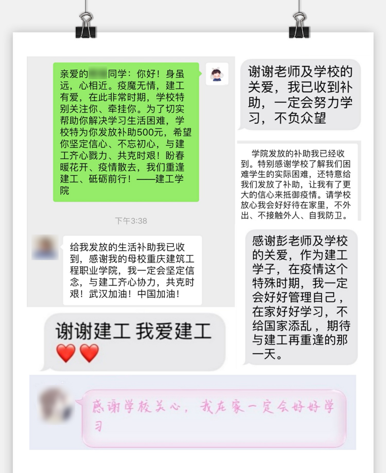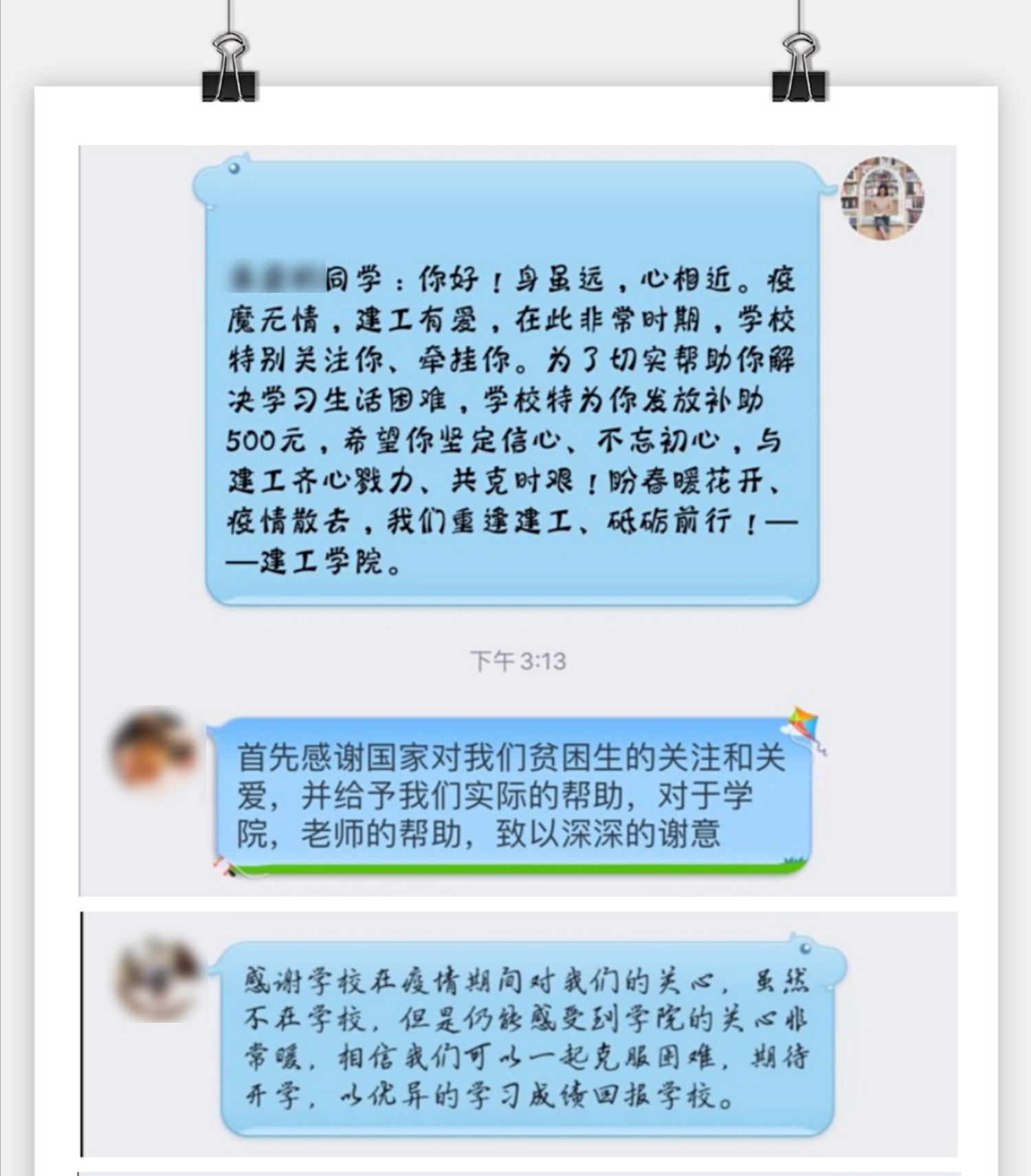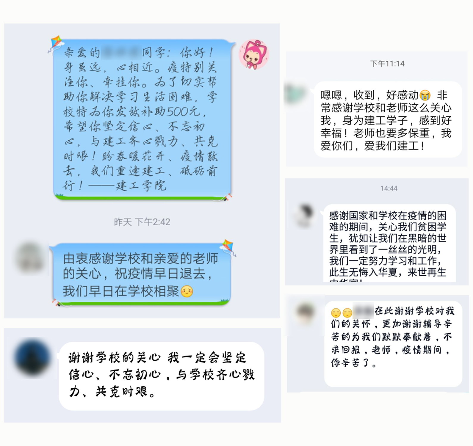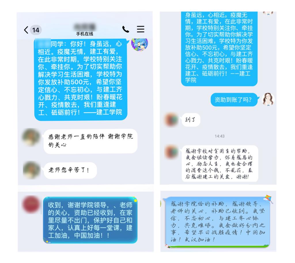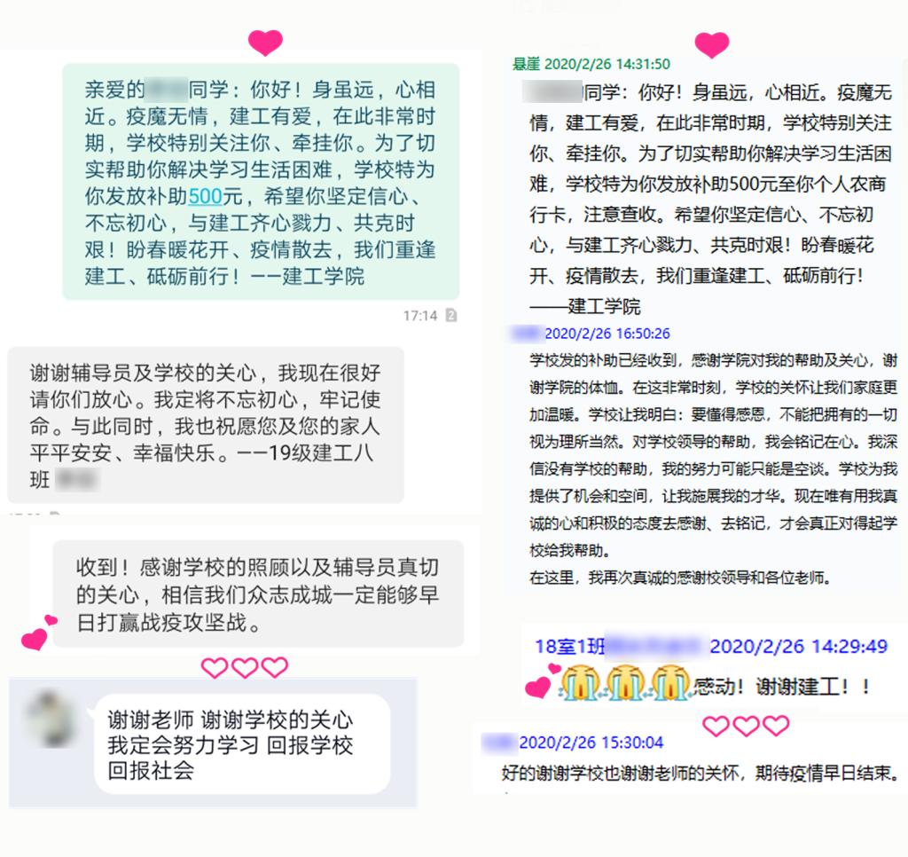 “亲爱的xx同学:你好!身虽远,心相近;疫魔无情,建工有爱,在此非常时期,学校特别关注你、牵挂你。为了切实帮助你解决学习生活困难,学校特为你发放补助XXX元,希望你坚定信心、不忘初心,与建工齐心戮力、共克时艰!盼春暖花开、疫情散去,我们重逢建工、砥砺前行! ——建工学院”