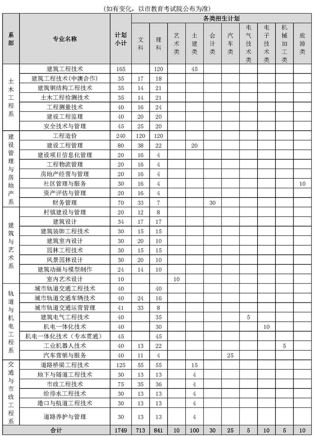 学院2019年高职分类考试招生计划