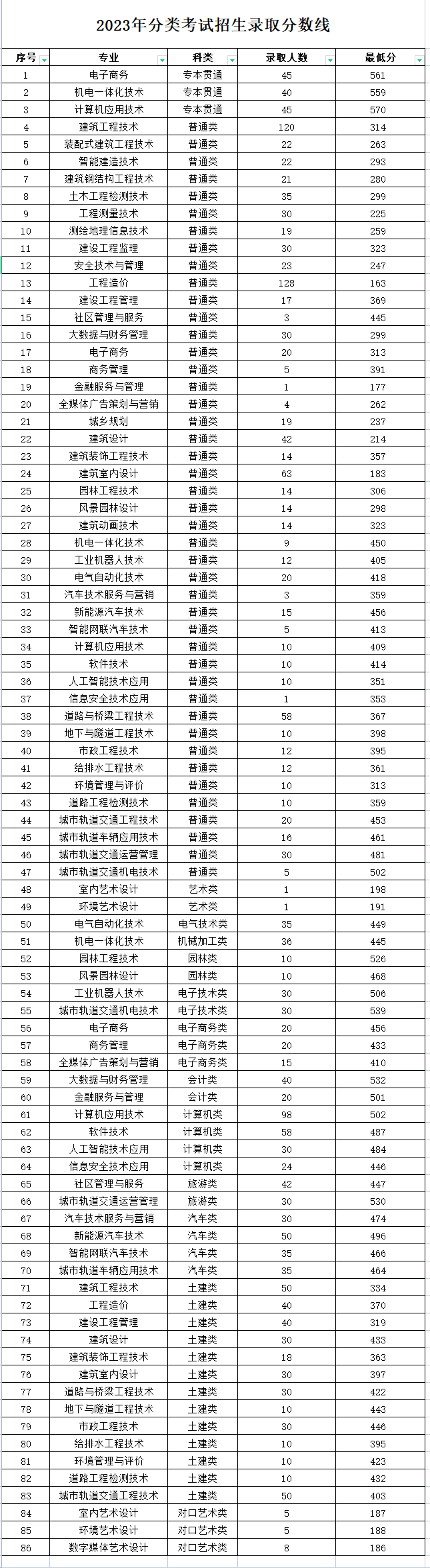 学校2023年高职分类考试招生录取分数线