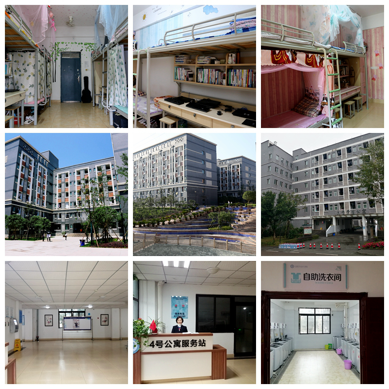 学生公寓为6人间 。每个房间都带独立阳台 、独立卫生间, 配有床 、衣柜 、 书桌 、风扇 、空 调 、淋浴 、热水 、 网络等设施设备 ,每栋楼配有自助洗衣设备 。公寓引进无感人脸识别系统 、学工管理系统, 并有宿管老师24小时值班 、 巡逻, 安全规范化管理水平高 。公寓服务台配有针线 包 、急救包 、 电子秤 、微波炉等物品 ,可以为同学们提供报修 、救助 、投诉 、熟食加热等方便快 捷的一站式服务 。每栋公寓一楼都提供有学生自习室 、党团活动室 、心灵驿站等功能房间 ,保证 学生拥有自由学习 、交流的空间。
