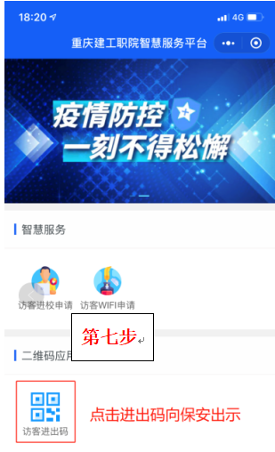 1. 校外人员访问学院,通过微信关注“重庆建工职院智慧服务”公众号,点击“访客入口”并登陆