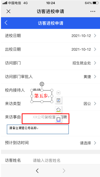 3. 如实填写相关信息后提交审核。需要填写到校日期、选择访问部门(请选择招生就业处),选择对应的访问部门审批人,填写好校内接待人(填写:黄捷)、来访类型(因公/因私)、来访事由(请备注公司名称+专场类别:123公司建筑类专场)。